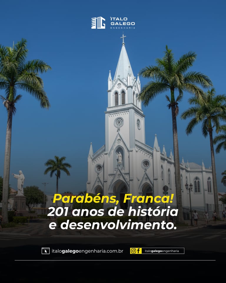 Franca é uma cidade que se constrói todos os dias com trabalho, talento e dedicação. Terra de empreendedores, inovadores e profissionais que transformam ideias em progresso, a nossa cidade é exemplo de crescimento e de amor pelo que faz. A IG Engenharia tem orgulho de fazer parte dessa história, contribuindo para o desenvolvimento urbano e estrutural da região com projetos que unem técnica, segurança e beleza arquitetônica. Cada obra que ajudamos a erguer é também uma homenagem a esta cidade que acreditamos e queremos ver crescer ainda mais. Parabéns, Franca, por mais um ano de conquistas, tradição e futuro! Que venham muitos outros capítulos de sucesso, e que a engenharia continue sendo parte dessa evolução. 📞 (16) 99966-5648 🌐 italogalegoengenharia.com.br IG Engenharia — projetando o futuro com solidez.